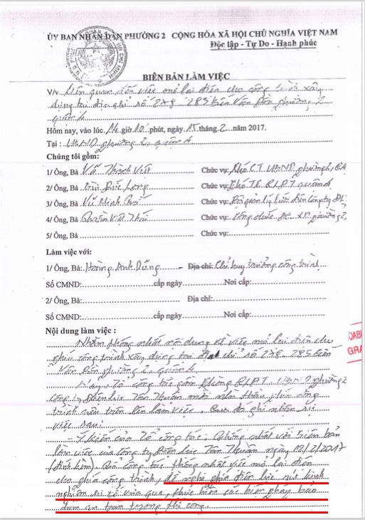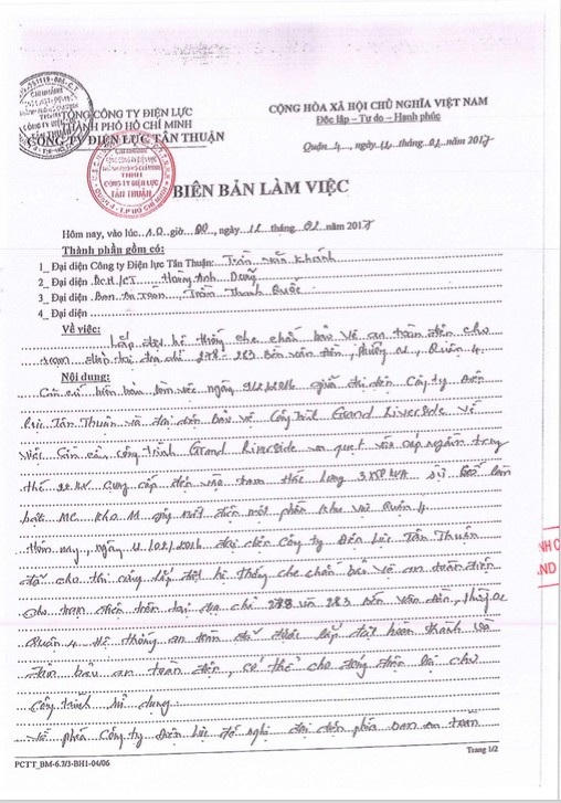 Tuy nhiên, biên bản ghi nhận hiện trường khi xảy ra sự việc ngày 09/02/2017 được lập giữa đại diện công ty điện lực Tân Thuận với Trưởng ban An toàn và Bảo vệ công trình Grand Riverside ghi trích yếu và một phần nội dung dễ gây hiểu nhầm.
