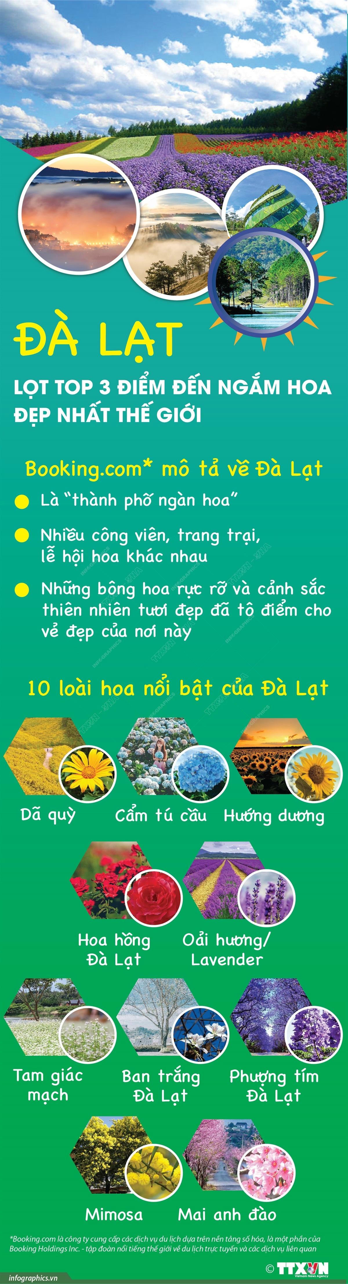 Đà Lạt lọt top 3 điểm đến ngắm hoa đẹp nhất thế giới Trong bảng xếp hạng của Booking.com (Hà Lan) về những điểm đến để ngắm hoa, TP Đà Lạt (tỉnh Lâm Đồng) đứng thứ 3 trong top 10 cái tên được du khách đánh giá cao nhất. Thứ Hai 28/03/2022 18:13 (GMT+7)