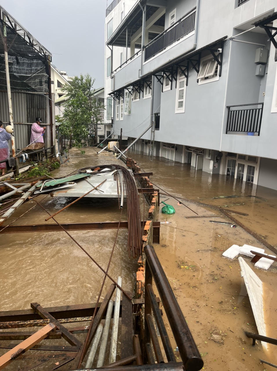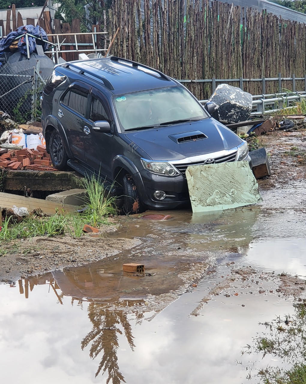 Mưa lớn khiến đường và ô tô bị ngập.