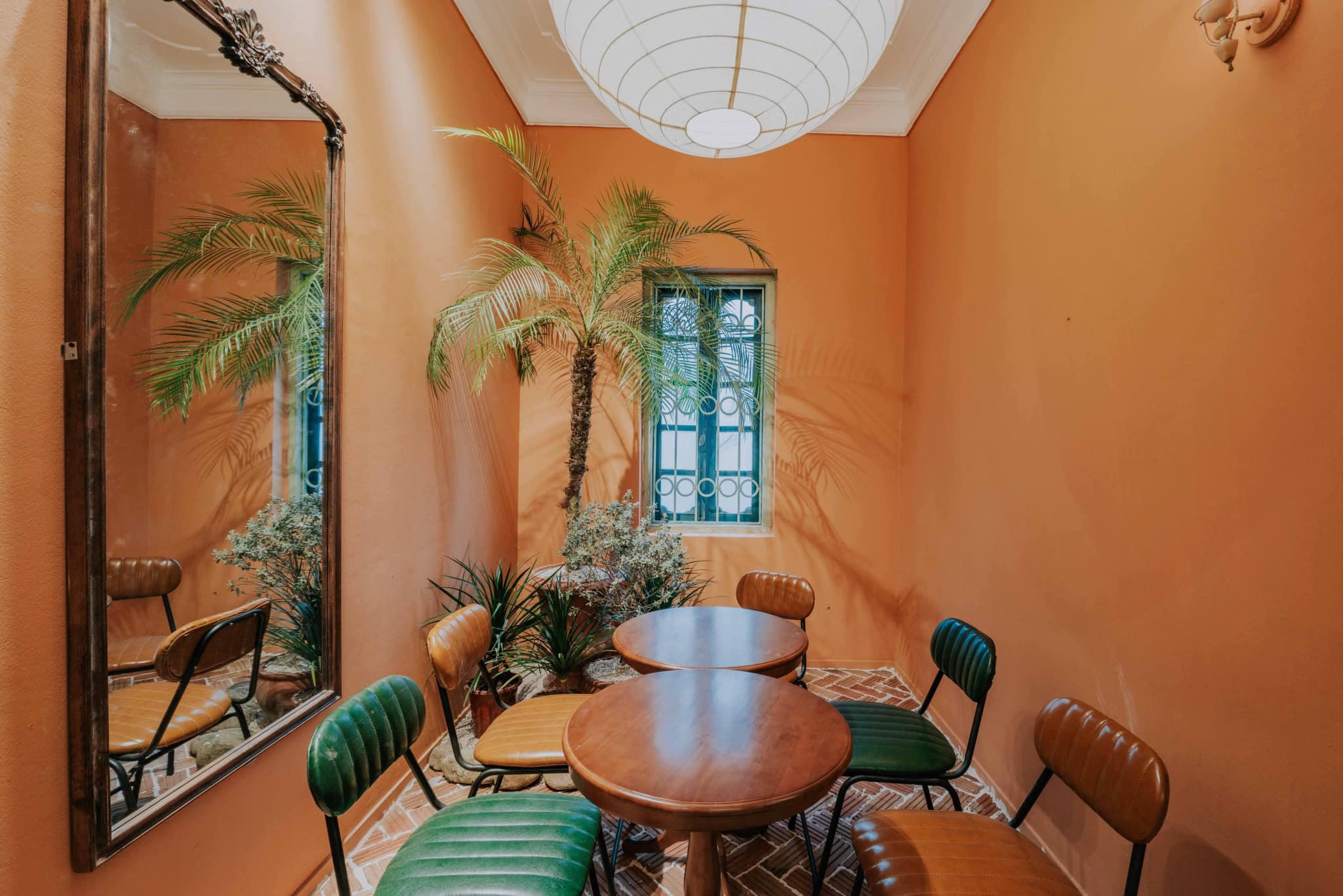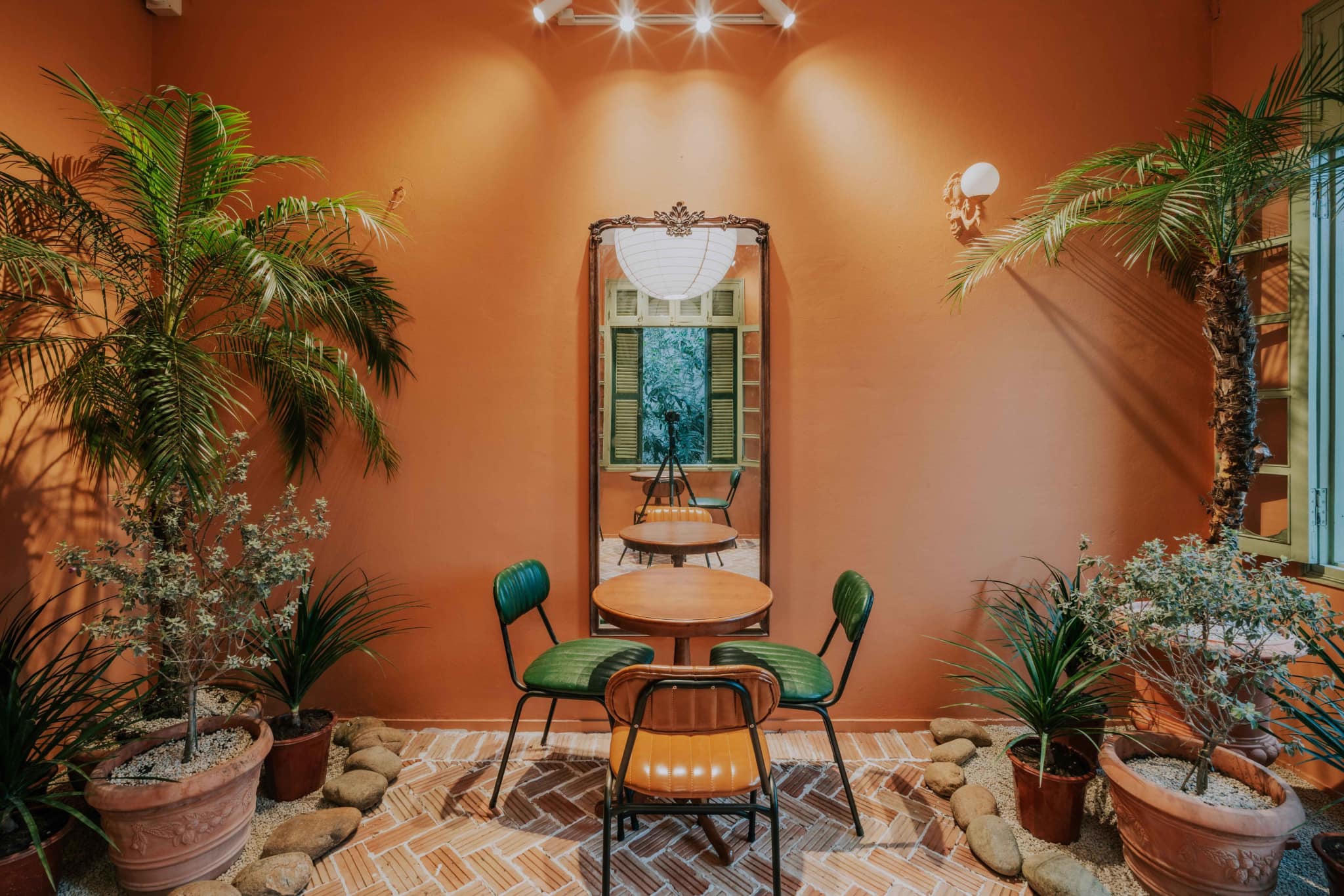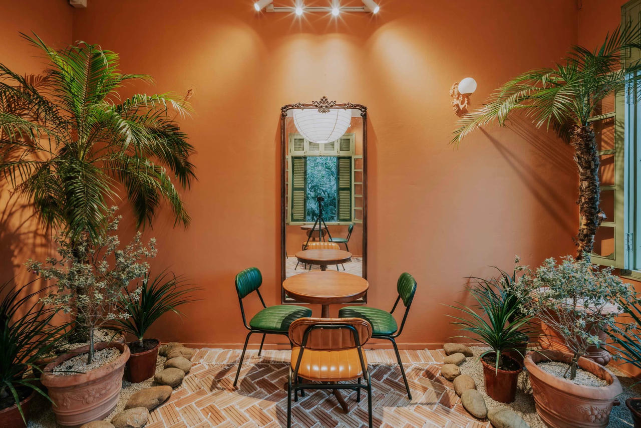 | Bên trong căn hộ, được sơn màu cam đất cùng với thiết kế bàn tròn và ghế tông màu cam đất và xanh lá cây khiến không gian trở nên hòa quyện, thống nhất. |