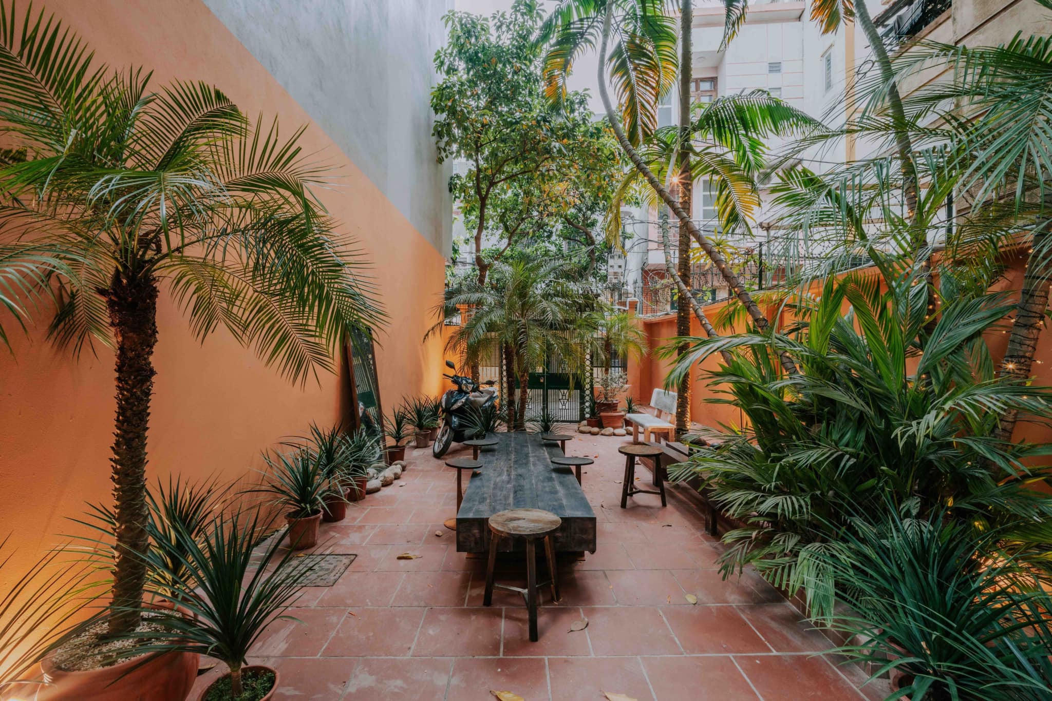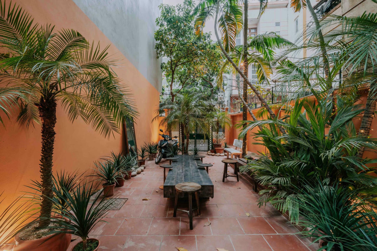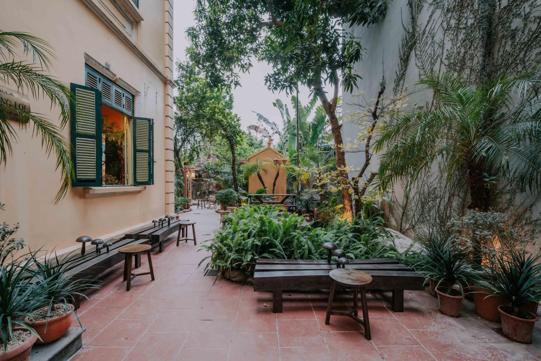| Một góc sân vườn bên ngoài căn biệt thự với những chiếc bàn tròn và ghế gỗ dài màu nâu đất, mang lại cảm giác vừa xưa cũ, vừa gần gũi với thiên nhiên. |