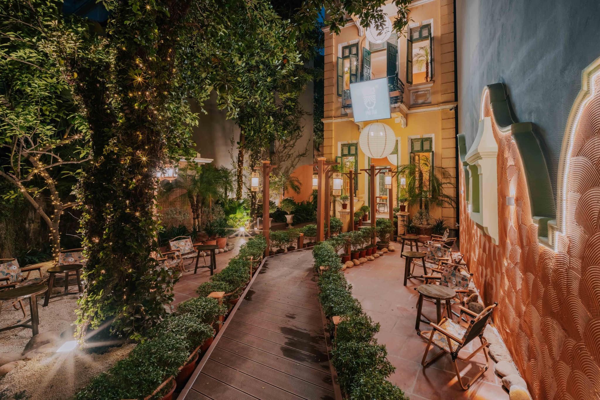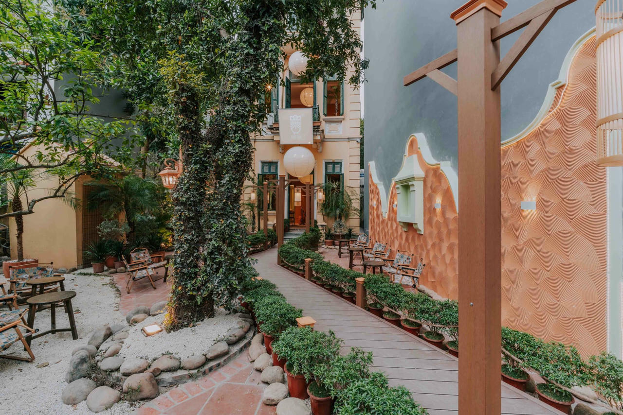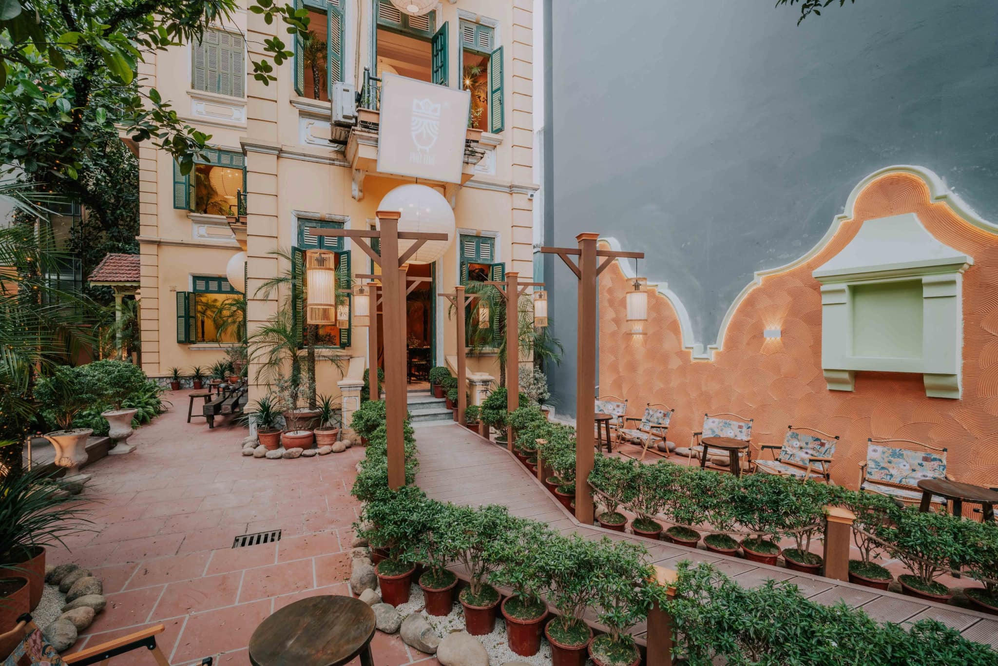 | Một góc sân vườn bên ngoài căn biệt thự với những chiếc bàn tròn và ghế gỗ dài màu nâu đất, mang lại cảm giác vừa xưa cũ, vừa gần gũi với thiên nhiên. |