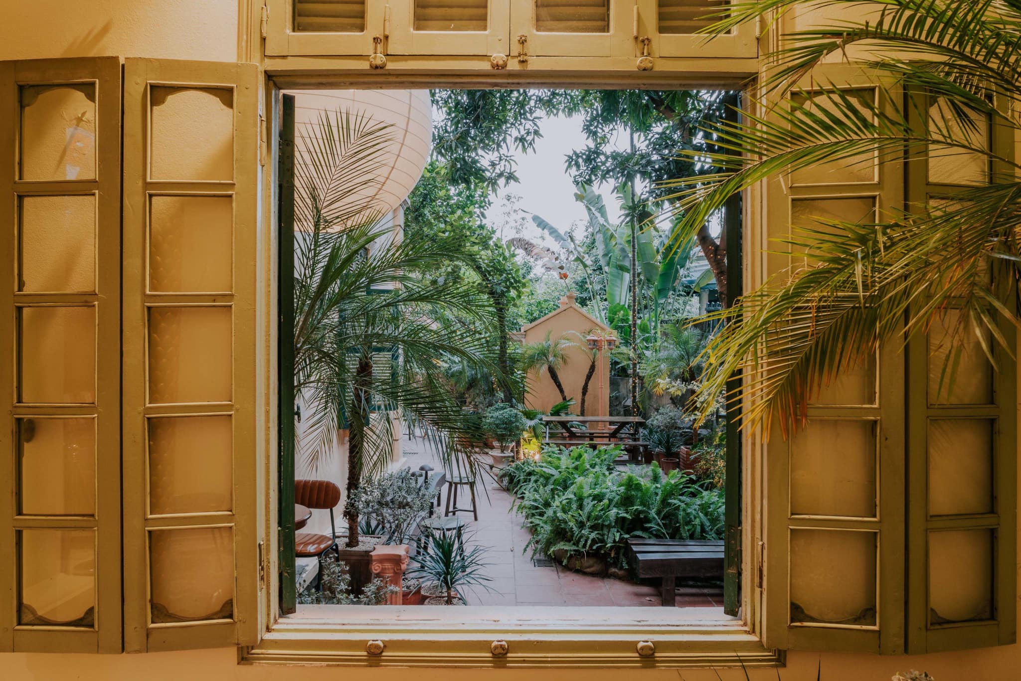 | Một cánh cửa lớn nhìn thẳng ra vườn. |