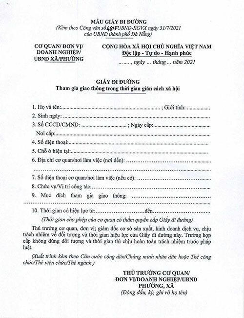 Mẫu giấy đi đường do Đà Nẵng ban hành, áp dụng bắt buộc cho tất cả người dân. |