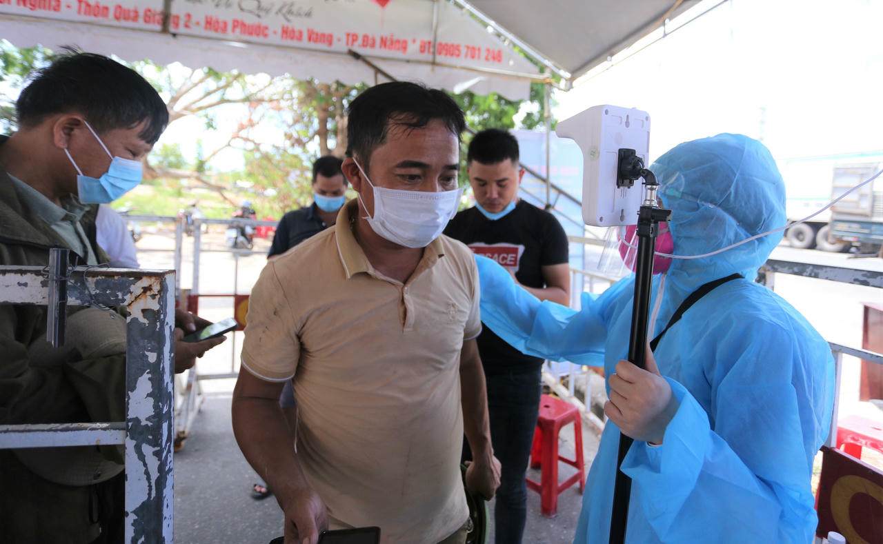 Nhân viên y tế đo thân nhiệt cho người dân tại chốt kiểm soát dịch ở cửa ngõ Đà Nẵng. |
