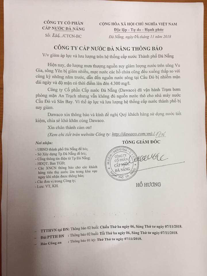 Tối ngày 7/11, Sở Xây dựng TP. Đà Nẵng cũng phát đi thông tin liên quan đến tình trạng mất nước sinh hoạt những ngày qua và giải pháp khắc phục.