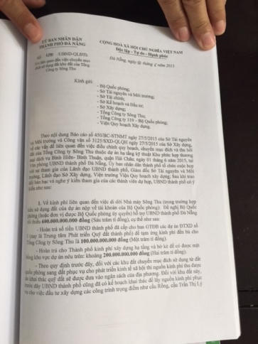 Trong văn bản, ông Huỳnh Đức Thơ cho biết, về kinh phí liên quan đến việc di dời Nhà máy Sông Thu (trong trường hợp tiền sử dụng đất của dự án nộp về tài khoản của Bộ Quốc phòng) thì “đề nghị Bộ Quốc phòng (hoặc đơn vị được Bộ Quốc phòng ủy quyền) hỗ trợ TP tối thiểu 600 tỉ đồng”.