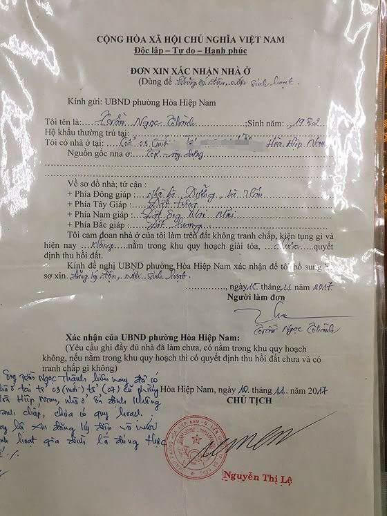 Xem xét hồ sơ (bản photocopy), bản thân Chủ tịch UBND phường Hòa Hiệp Nam nhận thấy có nhiều khuất tất trong hồ sơ này nên yêu cầu ông Nguyên giải trình. Ông Nguyên thừa nhận, cuối năm 2017, ông có nhận lời giúp ông Trần Ngọc Thành (người bà con) xác nhận có nhà để đăng ký điện, nước sinh hoạt, thấy chính đáng nên ông đã xác nhận dù không đúng chuyên môn, photocopy chữ ký Chủ tịch UBND phường để hợp thức hóa giấy tờ cho ông Thành.
