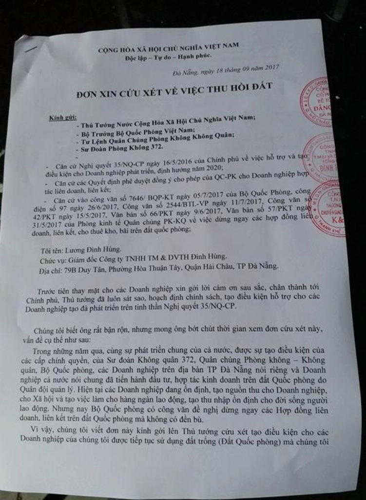 Ông Hùng, ông Dương, ông Dũng khẳng định, chủ trương của Bộ Quốc phòng hoàn toàn đúng đắn và DN rất đồng tình. Thế nhưng, cần phải cho họ thêm thời gian thực hiện. Ngoài ra, trong đơn cứu xét, đâị diện các DN cũng đề nghị thêm, nên chăng Bộ Quốc phòng cần làm toàn diện, tránh đối xử không công bằng giữa các DN, tránh lợi ích nhóm. Có đó, việc rà soát thu hồi phải được triển khai ở diện tích đất Quân khu 5, Quân chủng Hải quân đang cho thuê chứ không chỉ riêng đất khu vực sân bay Đà Nẵng.