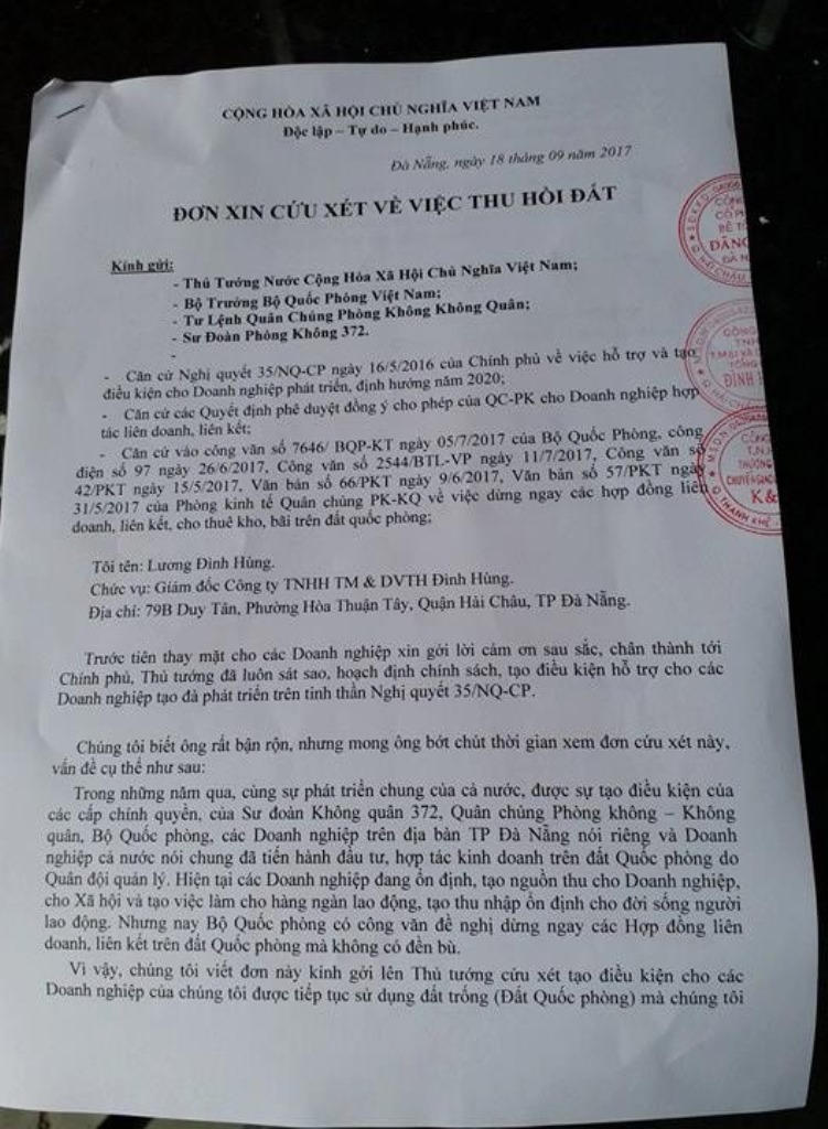 Ông Nguyễn Trọng Khải, Giám đốc Công ty TNHH Thương mại và Chuyển giao công nghệ K&H cho biết, từ tháng 2/2015 ông được thuê 2.880 m2 đất khu vực vành đai sân bay Đà Nẵng của Sư đoàn 372. Thời gian hợp đồng đến ngày 30/6/2018. Để cải tạo mặt bằng, xây dựng ban đầu, ông mất gần nửa năm sau mới có thể đưa Công ty đi vào hoạt động. Sau gần 2 năm, theo phê duyệt đề án thu hồi vốn sau 3 năm vẫn chưa được, ông đột ngột nhận được thông báo Bộ Quốc phòng sẽ thu hồi lại đất đã cho thuê với thời gian khá gấp rút.