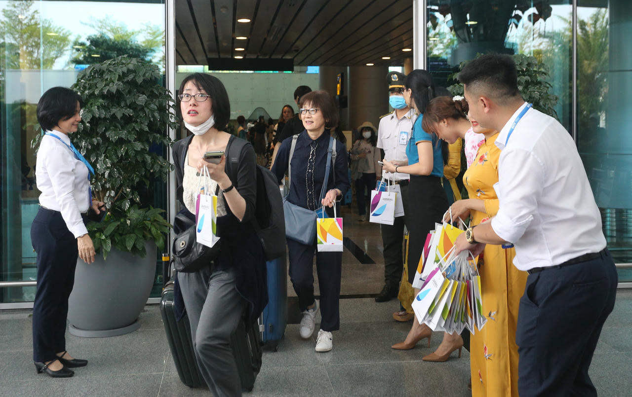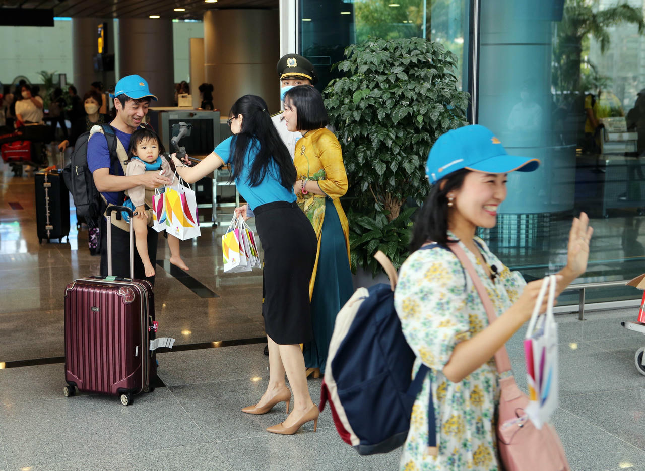 Du khách được tặng quà lưu niệm khi vừa xuống sân bay quốc tế Đà Nẵng. |
