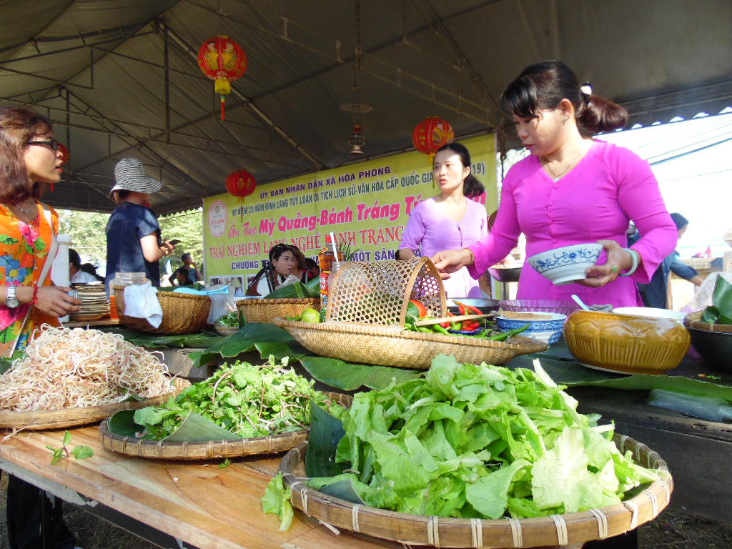 Nhiều sản vật của làng nghề truyền thống bánh tráng Tuý Loan được bày bán trong không gian đình làng. Làng Túy Loan nức tiếng món bánh tráng, mỳ Quảng...