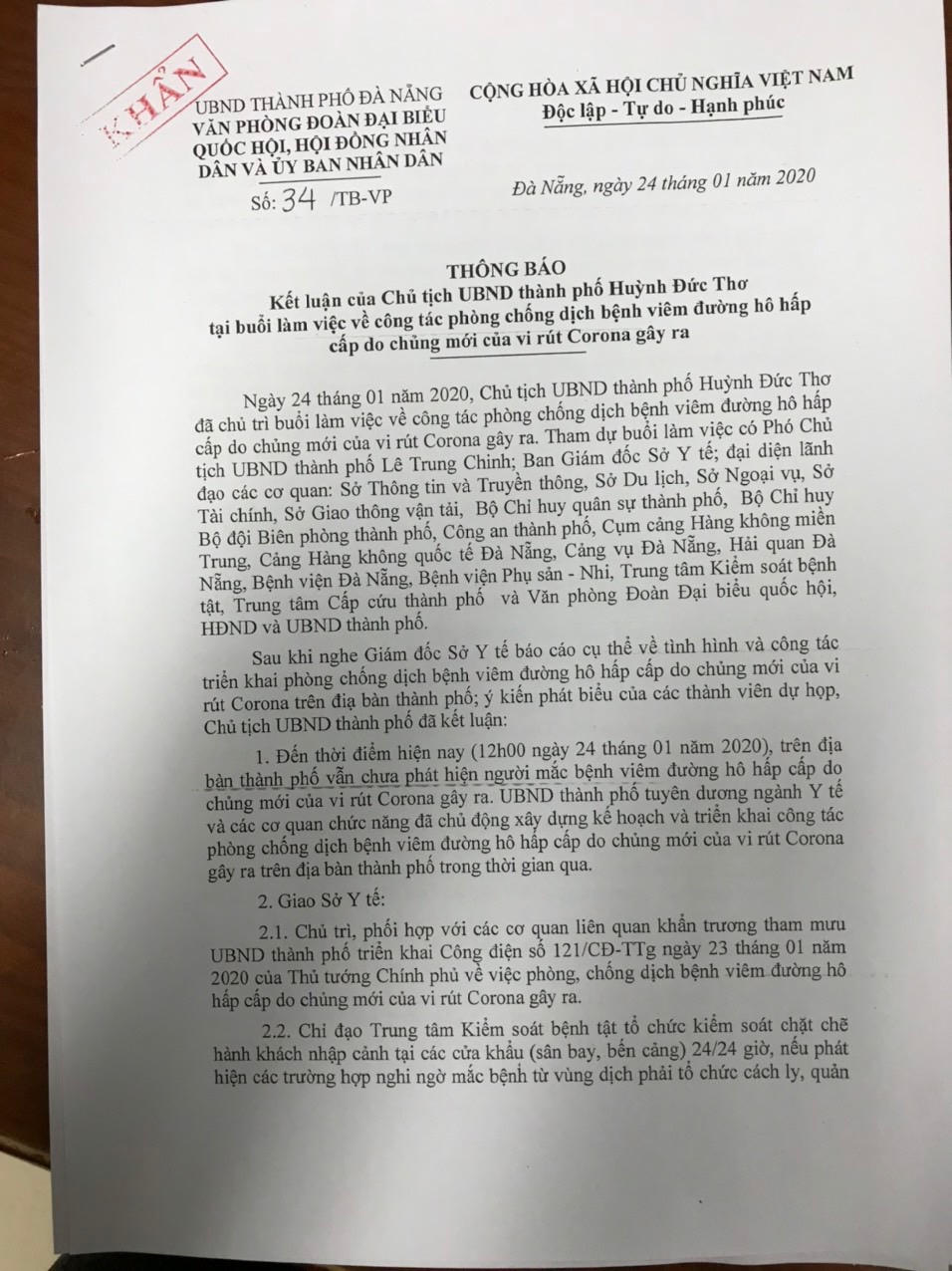 Trước tình hình bệnh viêm phổi cấp do virus corona mới gây ra đang diễn biến phức tạp và có khả năng lan nhanh, Chủ tịch UBND thành phố Huỳnh Đức Thơ đề nghị các đơn vị, ngành liên quan cần chuẩn bị kỹ lưỡng, không chủ quan với dịch bệnh. Đồng thời nhấn mạnh, Đà Nẵng là địa phương thu hút nhiều du khách đến từ Trung Quốc nên các đơn vị như y tế, biên phòng, sân bay, du lịch cần có sự phối hợp đồng bộ và hiệu quả.