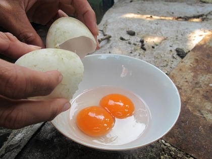 (PLO) - Đều đặn 4 năm nay, con vịt cỏ do gia đình bà Nguyễn Thị Hoài Thu (56 tuổi, ngụ phường Thọ Quang, quận Sơn Trà, TP Đà Nẵng) nuôi liên tục đẻ trứng đôi. Quả trứng đôi to gấp đôi hoặc gấp 3 so với quả trứng bình thường. Đặc biệt, bên trong lòng đỏ quả trứng có màu đỏ đậm.