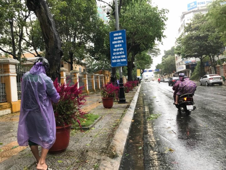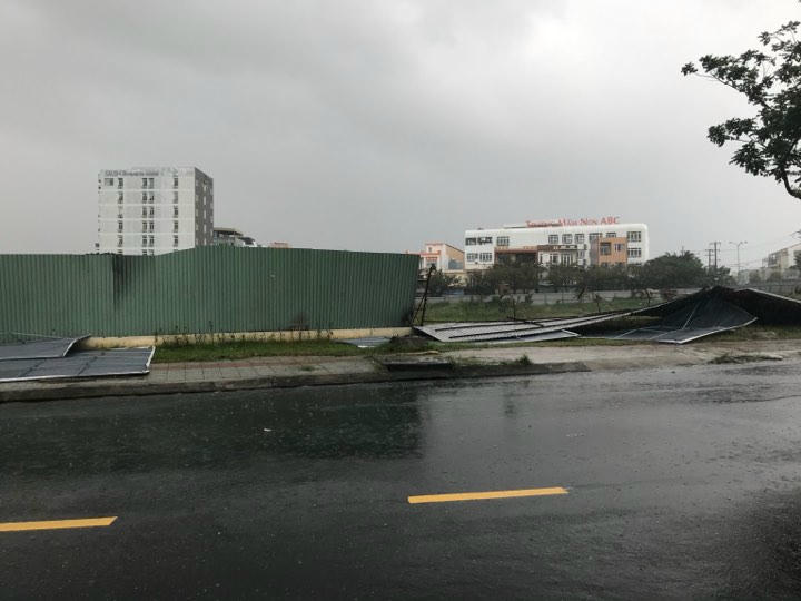 Sáng, trưa ngày 4/11, Đà Nẵng vẫn xuất hiện mưa lớn trên diện rộng, kèm theo gió mạnh. Dọc các tuyến đường ven biển Đà Nẵng như: Võ Nguyên Giáp, Hoàng Sa, Võ Văn Kiệt... cây cối bị mưa gió quật ngã, các hàng rào, pano quảng cáo bị xé toạc.