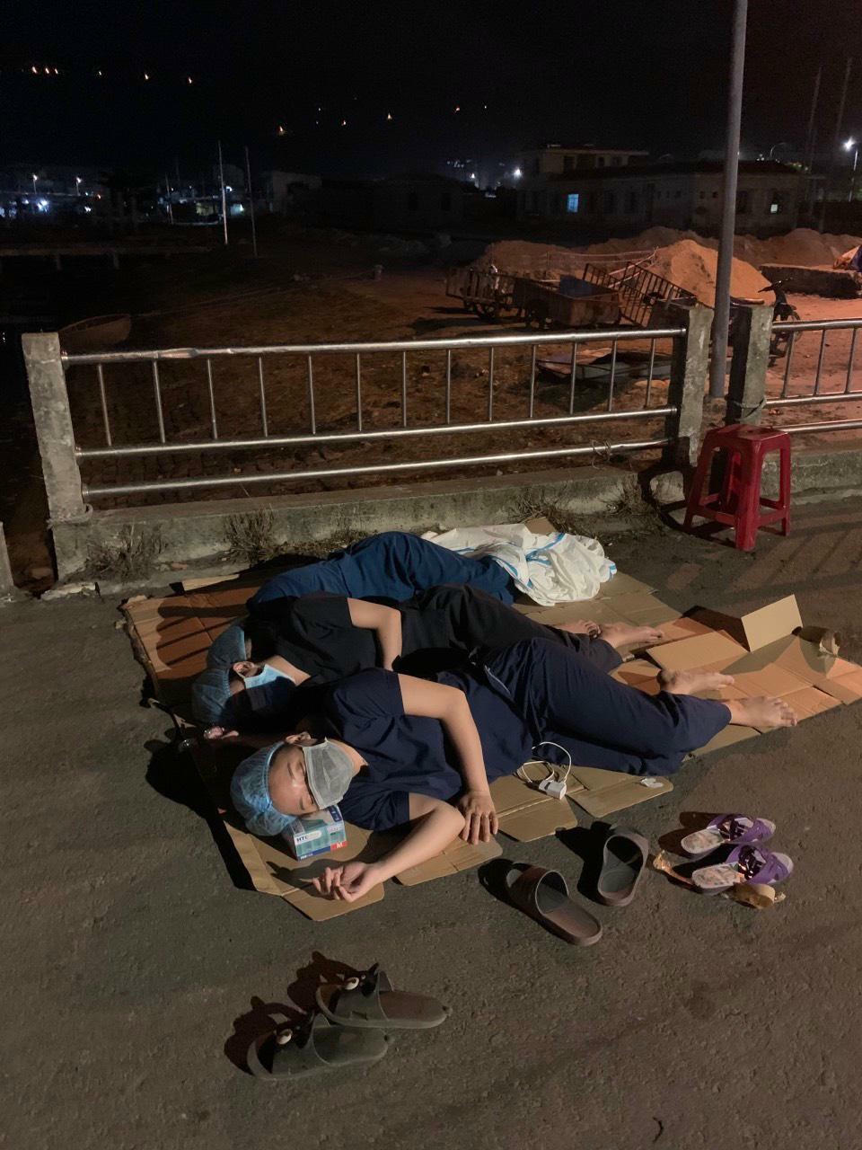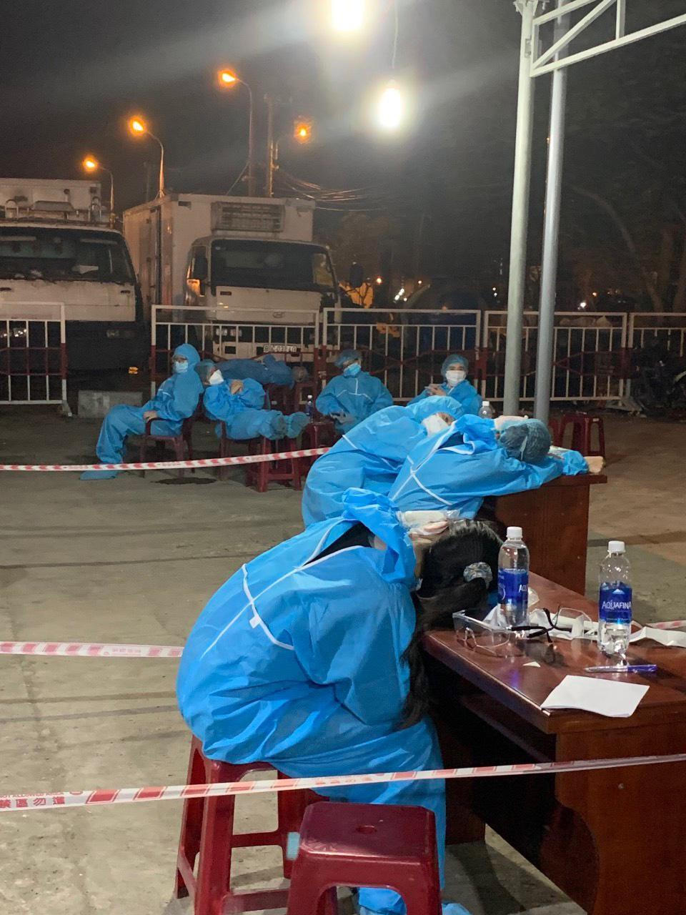 Nhân viên y tế tạm nghỉ ngơi ngay tại cảng cá Thọ Quang sau khi xuyên đêm hoàn thành lấy mẫu xét nghiệm. |