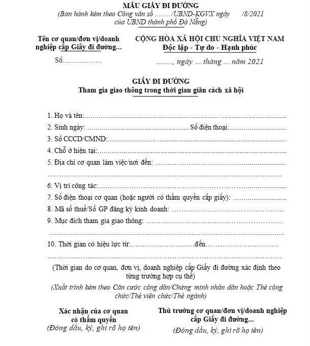 Trước đó, ngày 31/7, UBND TP Đà Nẵng đã ban hành mẫu giấy đi đường, thực hiện từ 18h cùng ngày. Trong mẫu này, đối với công nhân, nhân viên, người lao động làm việc tại nhà máy, cơ sở sản xuất; cơ sở kinh doanh, dịch vụ, công trình được phép hoạt động, thì Giám đốc công ty, doanh nghiệp có quyền cấp giấy đi đường cho nhân viên của mình.