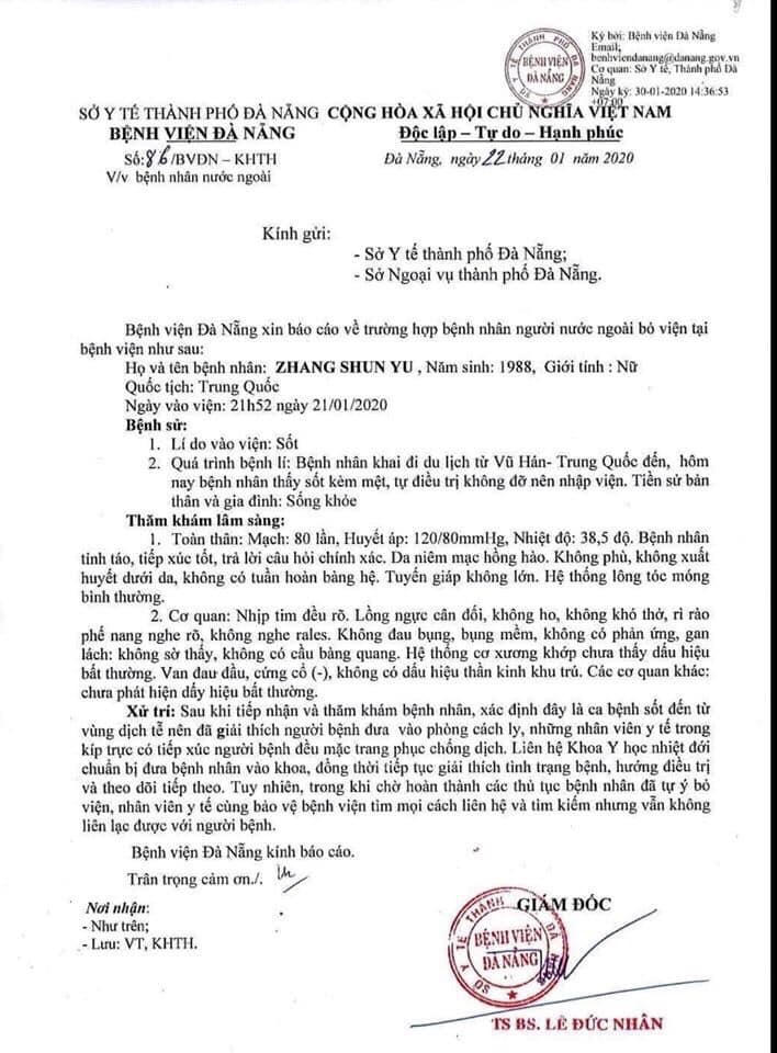 Chiều 22/1, đại diện Trung tâm Kiểm soát bệnh tật TP Đà Nẵng cùng đại diện BV Đà Nẵng xác nhận, bệnh nhân Zhang Shun Yu đã bay trên chuyến bay CZ (China Southern Airlines) 8368 đi từ sân bay quốc tế Đà Nẵng đến Trịnh Châu (Trung Quốc) lúc 16 giờ 38 ngày 22/1 trong tình trạng không sốt.