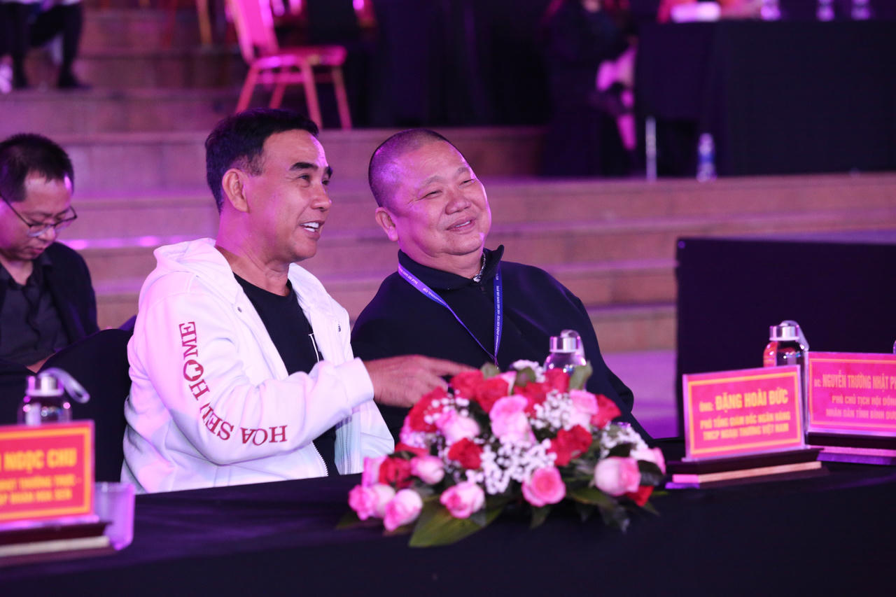 Ông Lê Phước Vũ - Chủ tịch Tập đoàn Hoa Sen (bên phải) trò chuyện cùng MC Quyền Linh. |