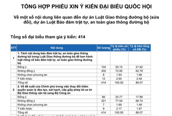 (PLVN) - Sau khi được gửi phiếu xin ý kiến, đa số đại biểu Quốc hội không tán thành việc ''tách'' Luật Giao thông đường bộ hiện hành thành 2 luật và không đồng ý chuyển thẩm quyền cấp giấy phép lái xe từ Bộ Giao thông vận tải sang Bộ Công an.
