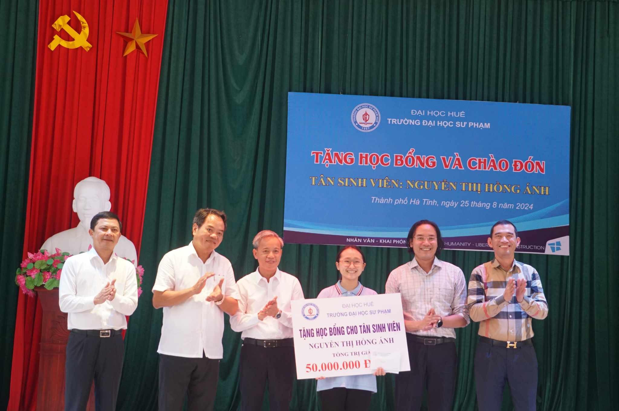 Sáng 25/8, Trường Đại học Sư phạm (Đại học Huế) phối hợp cùng Làng Trẻ em mồ côi Hà Tĩnh tổ chức chương trình tặng học bổng và chào đón tân sinh viên Nguyễn Thị Hồng Ánh.