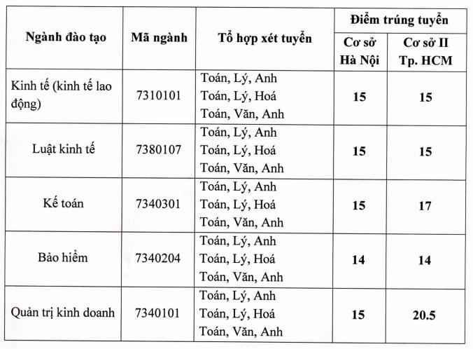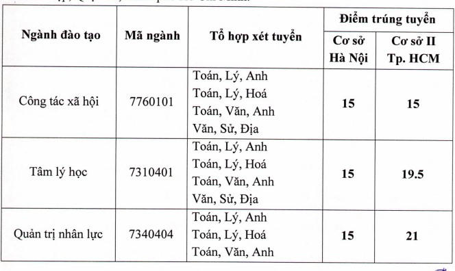 Theo đó, điểm chuẩn ở 2 cơ sở Hà Nội và TP HCM dao động từ 15 đến 21 điểm. Cao nhất là ngành Quản trị kinh doanh tại cơ sở TPHCM với 20,5 điểm. Có thể thấy, năm 2020, điểm chuẩn của Đại học Lao động - Xã hội tăng từ 1 đến 3 điểm các ngành đào tạo.
