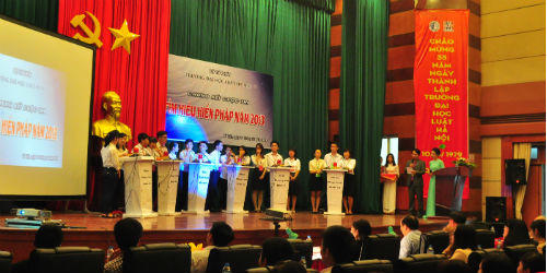 Đêm chung kết cuộc thi “Tìm hiểu Hiến pháp năm 2013” có sự tham gia của 6 đội chơi đến từ 6 liên chi đoàn. Các bạn thí sinh đã thể hiện rất thành công và rất tuyệt vời hình ảnh mang tính thương hiệu của người làm luật nói chung và thương hiệu của sinh viên Trường Đại học Luật Hà Nội nói riêng. Đây chính là những lẵng hoa tươi thắm của Đoàn trường, Hội Sinh viên và toàn thể sinh viên Trường Đại học Luật Hà Nội dâng lên Nhà trường chào mừng kỉ niệm 35 năm Ngày thành lập.