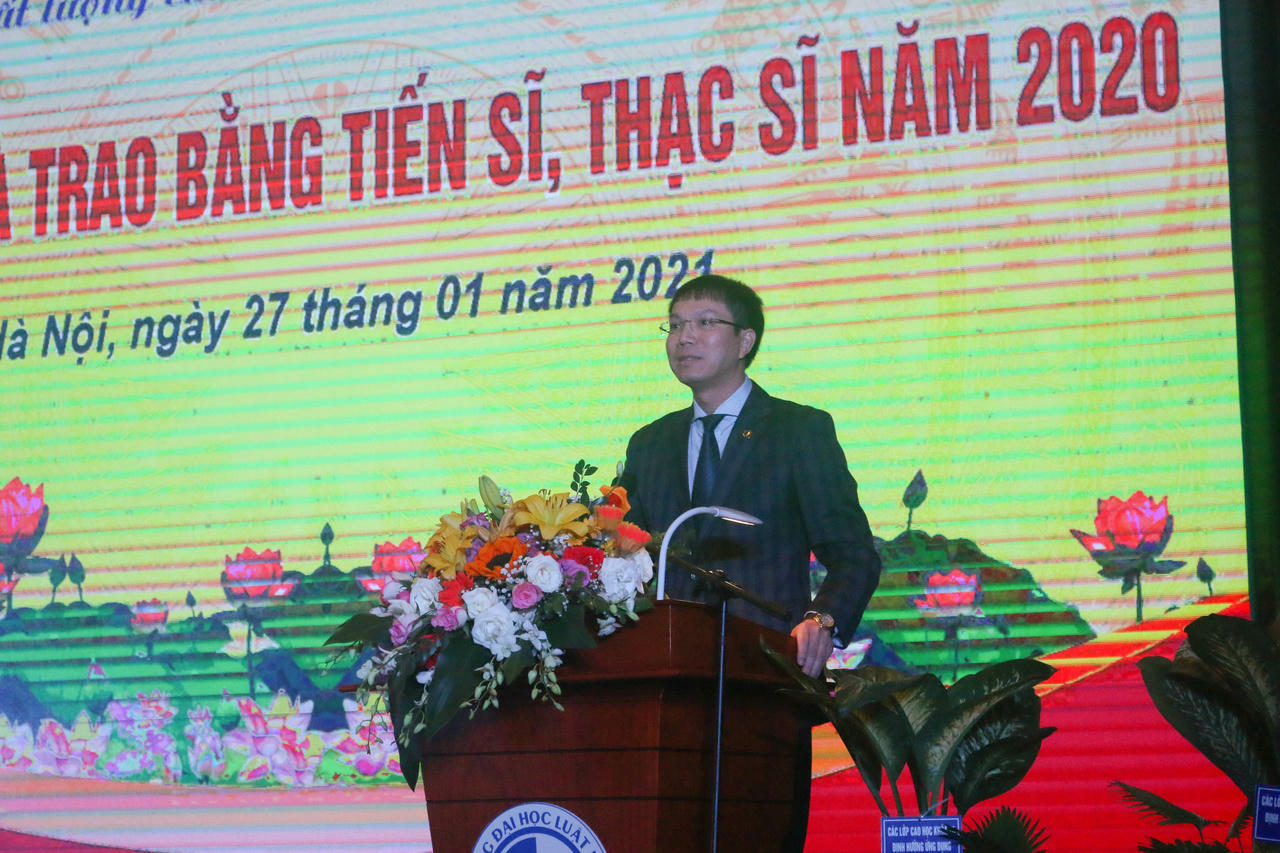 Phát biểu tại buổi Lễ, Hiệu trưởng Đoàn Trung Kiên chúc mừng các học viên của Lớp cao học khoá 26 và Lớp Nghiên cứu sinh khoá 21. Đồng thời nhấn mạnh đây là tiền đề, là hành trang để các học viên vững bước trên con đường công danh sự nghiệp, tiếp tục phấn đấu và cống hiến hết sức mình, để thông qua đó góp phần quảng bá hình ảnh Trường Đại học Luật Hà Nội và đóng góp công sức vào việc xây dựng trường trở thành trường trọng điểm quốc gia về đào tạo cán bộ pháp luật cho đất nước.