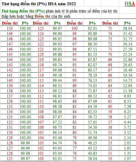 Năm 2022, phiếu báo kết quả thi HSA của thí sinh được bổ sung thêm trường thông tin thứ hạng điểm thi của từng đợt thi tương ứng. Theo đó, thứ hạng điểm thi (P%) là phép so sánh tương đối phản ánh điểm của đợt thi/kỳ thi bằng hoặc thấp hơn điểm của thí sinh trong đợt thi/kỳ thi đó. Tổng hợp thứ hạng điểm thi (P%) của 10 đợt thi vừa qua được liệt kê ở bảng 1. Bên cạnh thông tin về điểm thi, phổ điểm HSA năm 2022 thì thứ hạng điểm thi là một trong những công cụ quan trọng để xét tuyển thí sinh theo năng lực cá nhân.