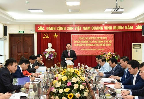 Phát biểu tại buổi làm việc, Bí thư Thành ủy Hà Nội Vương Đình Huệ đánh giá Đại học Thủ đô đã có nỗ lực lớn, trong thời gian qua làm được nhiều việc từ xây dựng chiến lược phát triển, đào tạo, bồi dưỡng, xây dựng đội ngũ, mạnh dạn mở một số ngành để đáp ứng nhu cầu phát triển của Thủ đô.