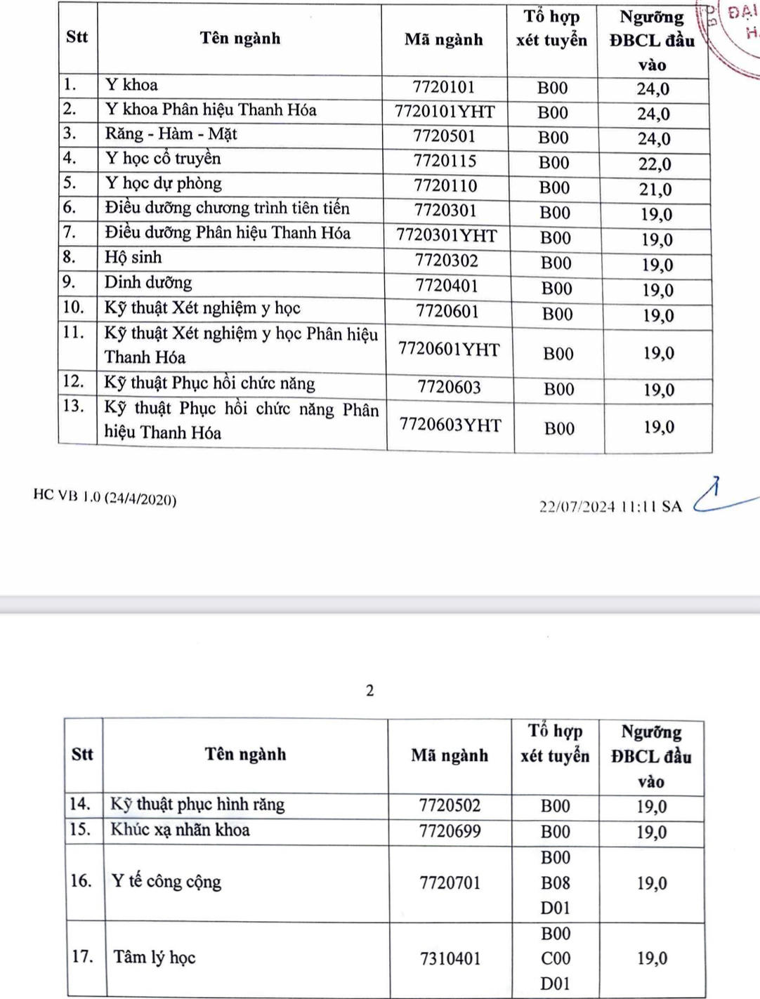 Theo đó, 3 ngành có điểm sàn xét tuyển cao nhất ở mức 24 điểm là Y khoa, Y khoa phân hiệu Thanh Hóa và Răng - Hàm - Mặt.