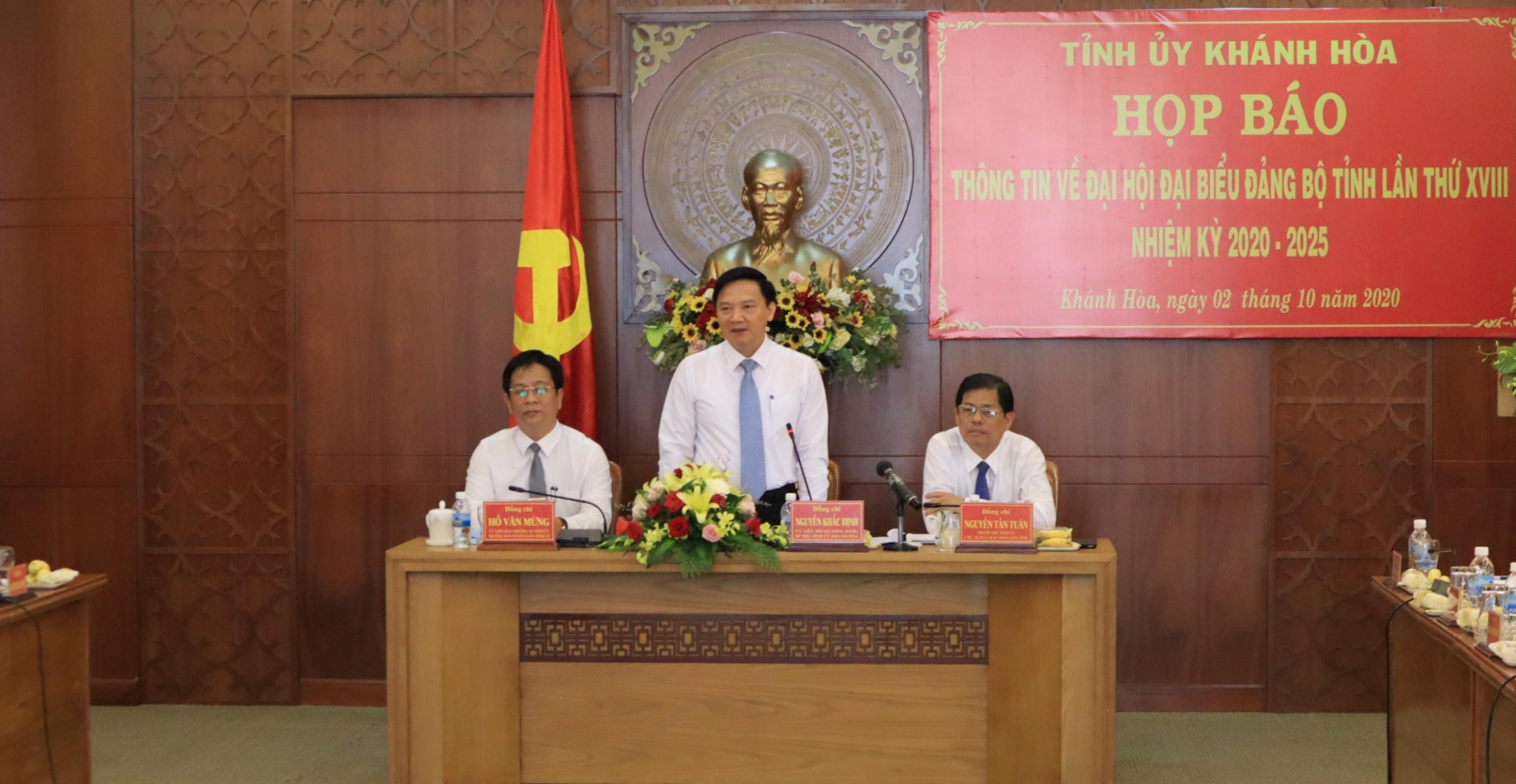 (PLVN) - Ngày 2/10, Tỉnh ủy Khánh Hòa đã tổ chức họp báo cung cấp thông tin về Đại hội đại biểu Đảng bộ tỉnh lần thứ XVIII, nhiệm kỳ 2020-2025. Tham dự họp báo có ông Nguyễn Khắc Định - Ủy viên Trung ương Đảng, Bí thư Tỉnh ủy Khánh Hòa; Nguyễn Tấn Tuân - Phó Bí thư Tỉnh ủy, Chủ tịch UBND tỉnh Khánh Hòa.