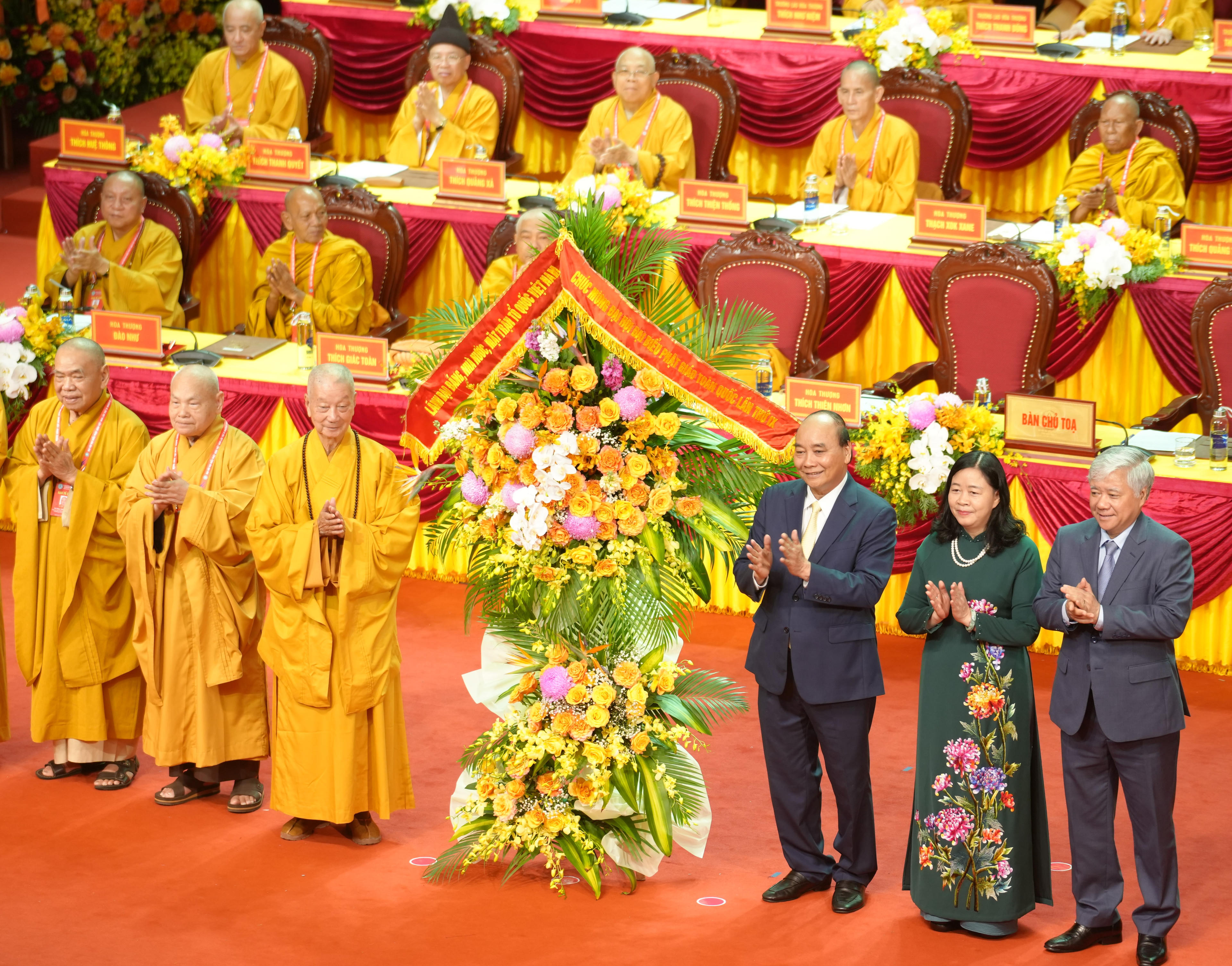 Thay mặt lãnh đạo Đảng, Nhà nước, Chủ tịch nước Nguyễn Xuân Phúc đến dự và phát biểu tại Đại hội. Chủ tịch nước Nguyễn Xuân Phúc bày tỏ vui mừng được biết trong nhiệm kỳ vừa qua, phát huy truyền thống vẻ vang, GHPGVN cùng các tăng ni đã tích cực hưởng ứng, vận động phật tử tham gia các phong trào thi đua yêu nước do các cấp chính quyền, Mặt trận Tổ quốc và đoàn thể phát động như xóa đói giảm nghèo, xây dựng nông thôn mới, khu dân cư văn hóa mới, đấu tranh phòng, chống các tệ nạn xã hội, tham gia bảo vệ môi trường, chống biến đổi khí hậu, phòng chống dịch bệnh... với nhiều cách làm hay, mô hình tiêu biểu.