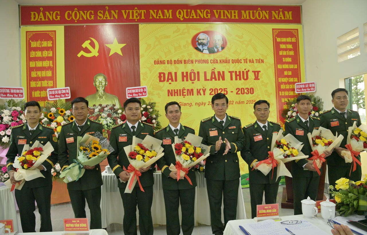 Đại tá Huỳnh Văn Đông - Bí thư Đảng ủy, Chính ủy Bộ đội Biên phòng tỉnh Kiên Giang tặng hoa chúc mừng 7 đồng chí được Đại hội bầu vào ban chấp hành khóa mới nhiệm kỳ 2025 - 2039. |