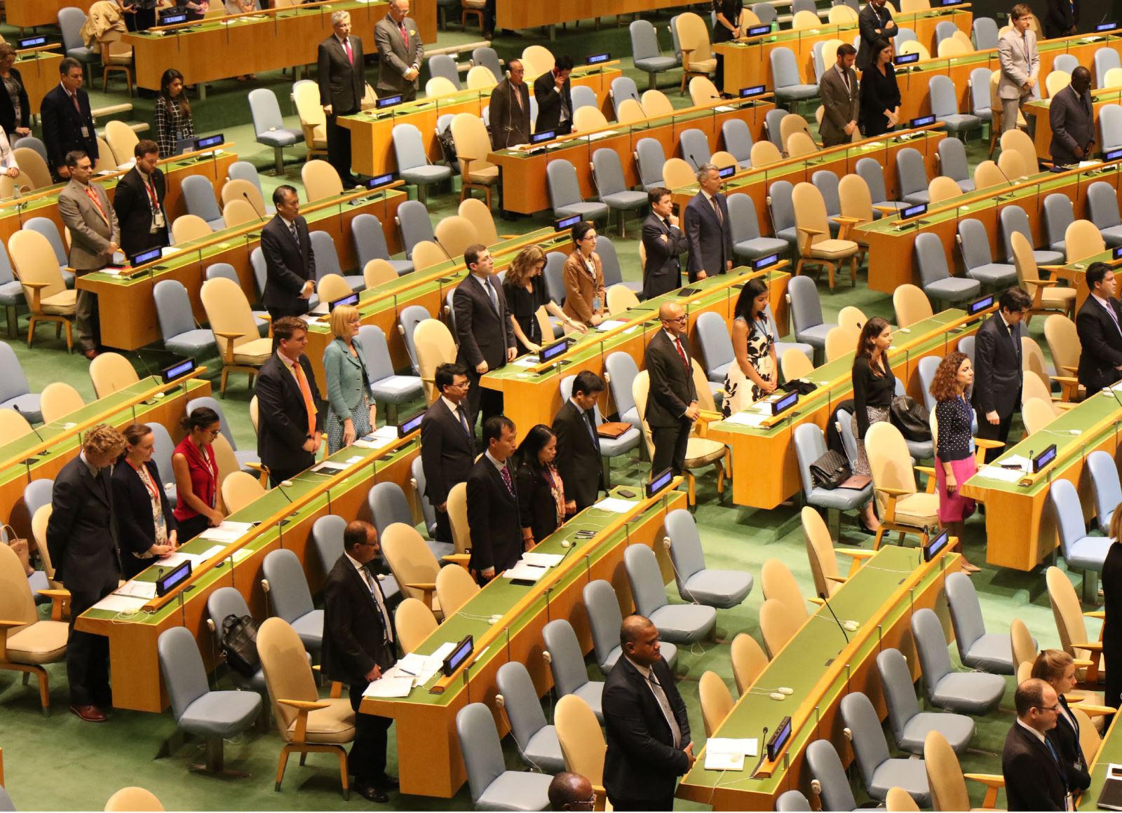 | Đại diện các nước tham dự phiên họp dành một phút mặc niệm Chủ tịch nước Trần Đại Quang. Ảnh: Hoài Thanh - Phóng viên TTXVN tại Mỹ |