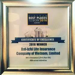 (PLO) - Ngày 23/3, tại TP. HCM, Công ty Bảo hiểm Nhân thọ Dai-ichi Việt Nam (“Dai-ichi Life Việt Nam”) đã vinh dự nhận giải Top 4 “Nơi làm việc tốt nhất Việt Nam” năm 2016 trong ngành bảo hiểm, bao gồm lĩnh vực nhân thọ và phi nhân thọ tại Việt Nam, và hạng thứ 36 trong Top 100 “Nơi làm việc tốt nhất Việt Nam” năm 2016 cho tất cả các ngành nghề, do mạng cộng đồng nghề nghiệp cấp quản lý Anphabe kết hợp cùng Công ty Nghiên cứu thị trường toàn cầu Nielsen tổ chức khảo sát và công bố.