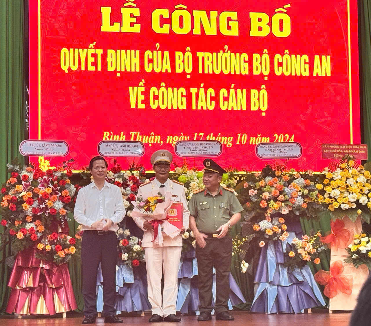 Tại Lễ công bố, thừa uỷ quyền của Bộ trưởng Bộ Công an, Đại tá Lê Quang Nhân, Giám đốc Công an tỉnh Bình Thuận đã trao Quyết định và tặng hoa chúc mừng các các bộ mới được Bộ Công an điều động.