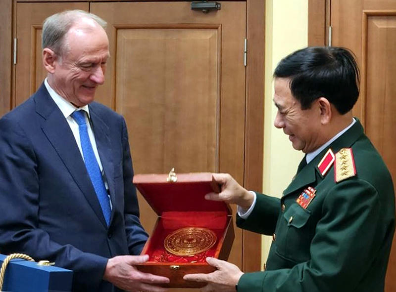 | Bộ trưởng Phan Văn Giang trao quà lưu niệm tặng Thư ký Hội đồng An ninh Quốc gia Liên bang Nga Nikolai Patrushev. |