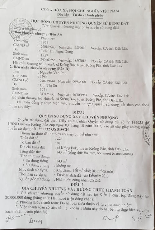 Theo đơn của bà Sử gửi đến báo Pháp luật Việt Nam trình bày: Năm 2014, gia đình bà có nhận chuyển nhượng thửa đất số 224, tờ bản đồ số 01, với tổng diện tích 343m2, có tứ cận; Bắc giáp Quốc lộ 26; Đông giáp đất ông Lương Văn Bang và bà Dương Thị Khánh Hòa; Tây giáp đất ông Nguyễn Văn Phúc; Nam giáp đất ông Bang, bà Hòa.