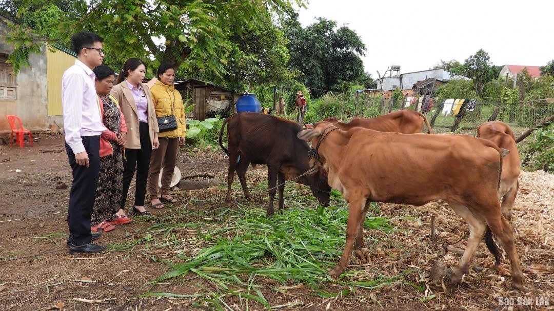 Cán bộ tín dụng kiểm tra nguồn vốn vay được người dân đầu tư chăn nuôi bò hiệu quả. |