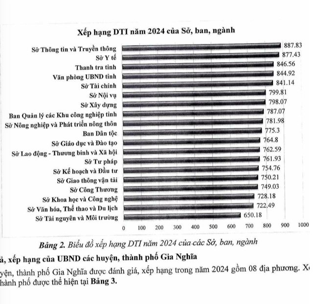 Theo báo cáo, xếp hạng DTI các sở, ban, ngành của Đắk Nông đứng đầu là Sở Thông tin và Truyền thông với 887,83 điểm; Sở Y tế với 877,43 điểm...,thấp điểm nhất là Sở Tài nguyên và Môi trường với 650,18 điểm.