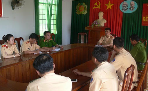 | Đại tá Hồ Công Hoa - Trưởng Phòng PC67 Đăk Nông họp với Công an huyện Krong No - Đăk Mil để xử lý xe quá tải trọng. |