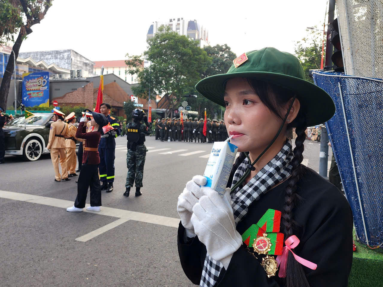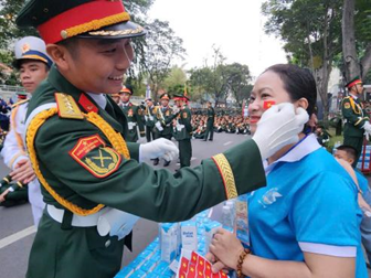 Bạn trẻ Vũ Lê Việt, đội Dân quân tự vệ Ban chỉ huy Quân sự TP Thủ Đức sau những phút bận rộn tiếp sức chai nước, hộp sữa cho các chiến sĩ thì đăm chiêu ngắm nhìn hàng ngũ diễu binh, em không ngần ngại bày tỏ mong ước một dịp nào đó bản thân sẽ được đứng trong hàng ngũ diễu binh như vậy.
