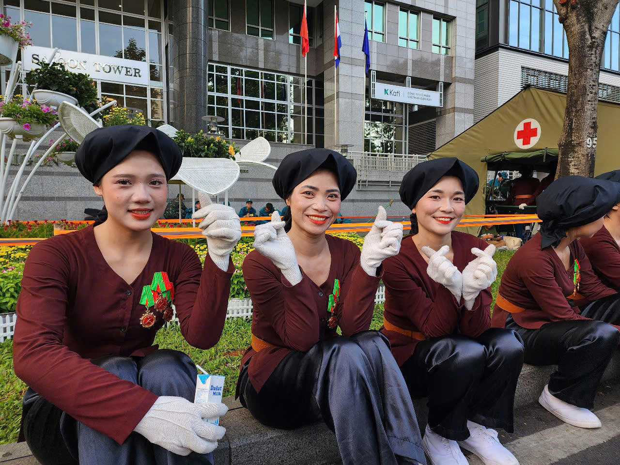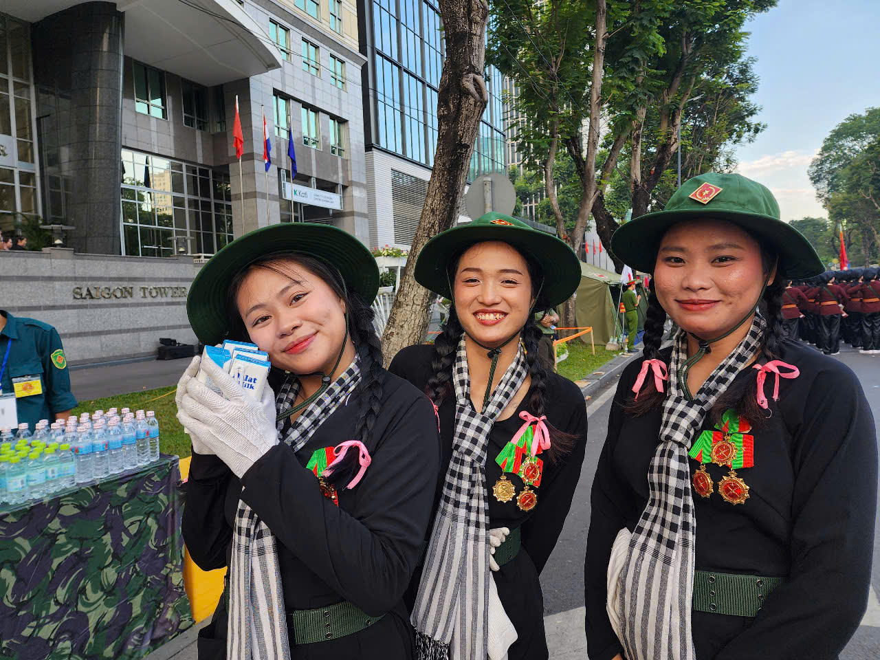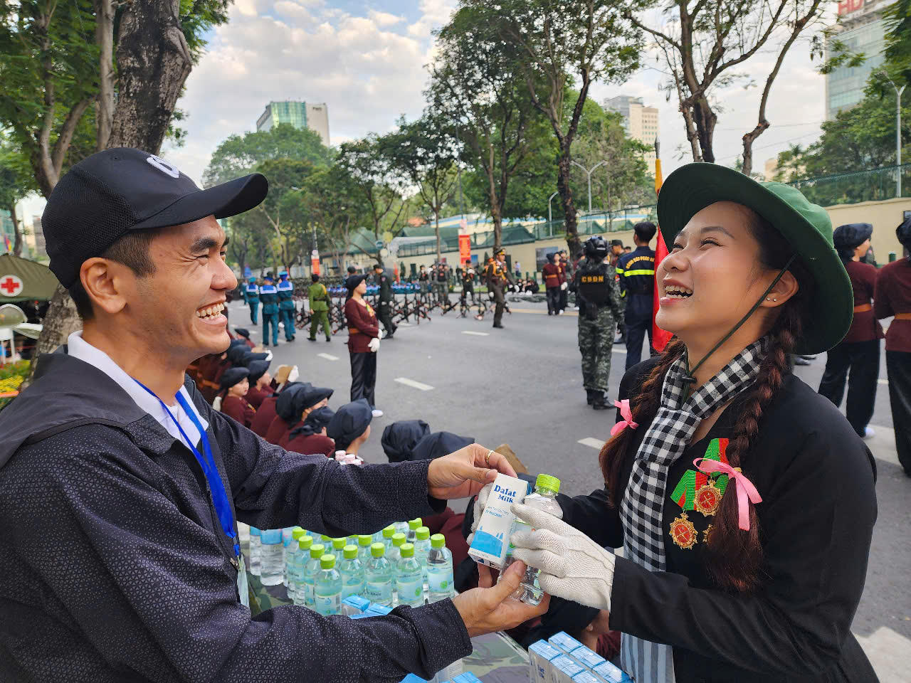 Do vậy khi trời tờ mờ sáng, các lực lượng tập kết về đầu tuyến đường Lê Duẩn chuẩn bị cho nghi thức diễu binh, diễu hành tiến về lễ đài, chị Thuận và các hội viên Hội liên hiệp Phụ nữ TP Thủ Đức sắp xếp gọn gàng từng chai nước, hộp sữa, rồi nhanh nhẹn hỏi thăm các chiến sĩ “Em ơi sữa, nước đây, tranh thủ uống, giữ sức khỏe hoàn thành nhiệm vụ nhen”.
