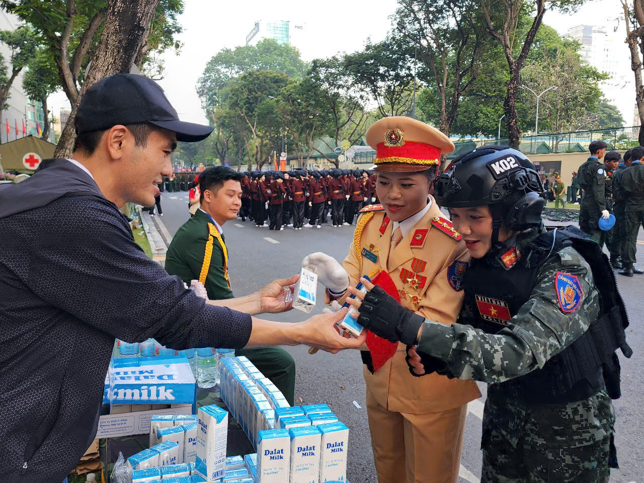 Các chiến sĩ khối Cảnh sát Cơ động, Công an TPHCM,… đón nhận hộp sữa Dalatmilk trong phút nghỉ tại chỗ trước giờ Tổng duyệt |