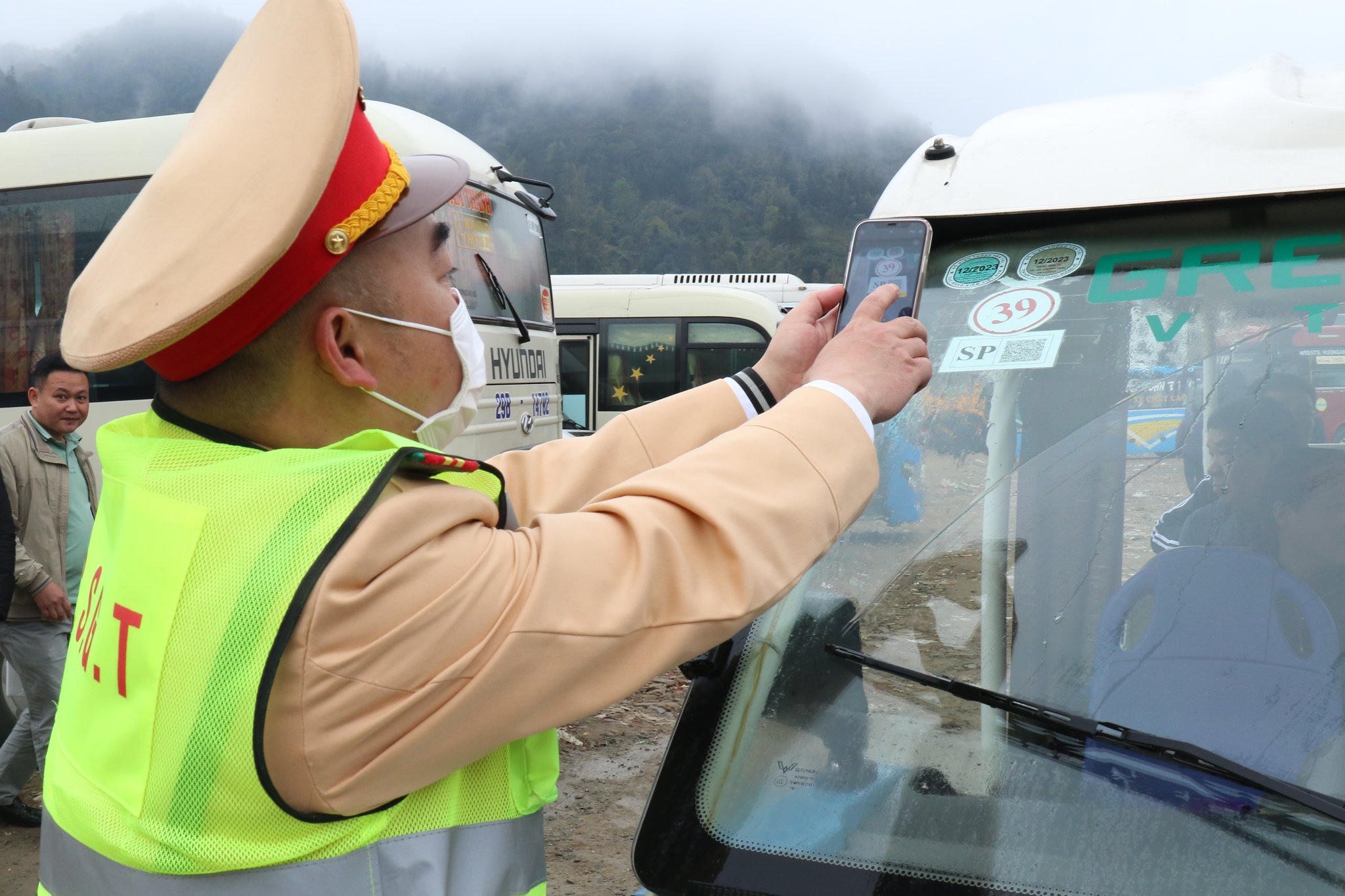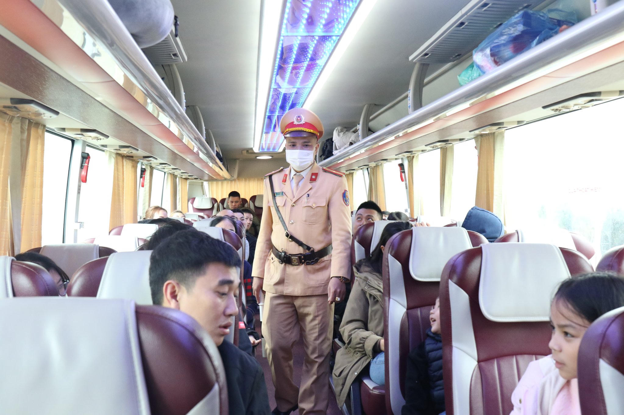 Cảnh sát giao thông kiểm tra số lượng hành khách trên xe để đảm bảo xe không chở quá số người quy định |