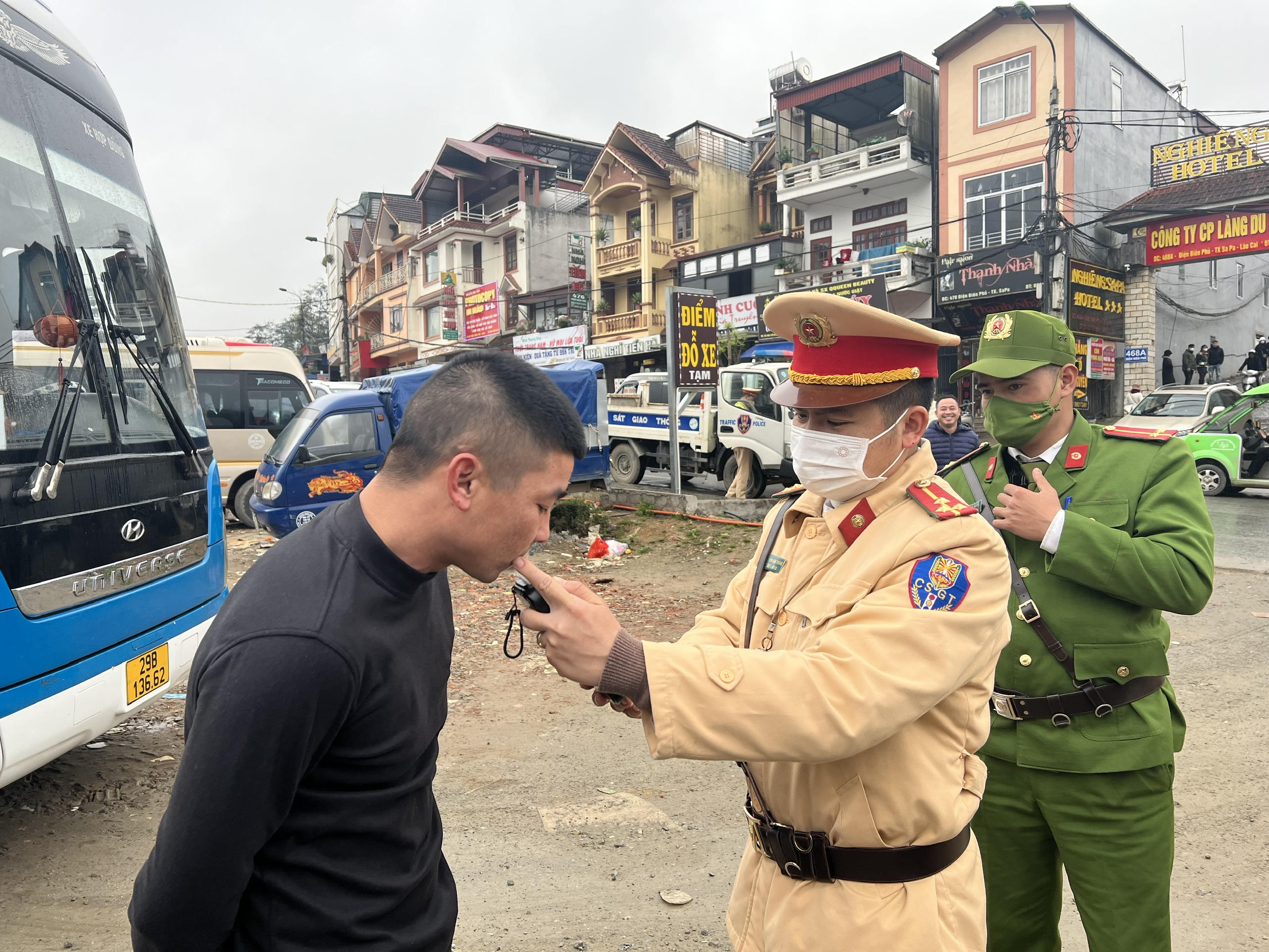 Ngoài ra, để tăng cường tuyên truyền xử lý nghiêm các trường hợp lái xe sử dụng nồng độ cồn khi tham gia giao thông, 2 tổ công tác Đội Cảnh sát giao thông, trật tự, Công an thị xã Sa Pa có mặt tại các bến xe, bãi để xe trên địa bàn để kiểm tra nồng độ cồn đối với lái xe khách chuẩn bị khởi hành xuất bến.