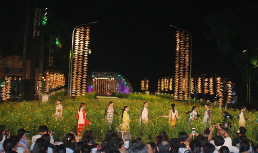 Không gian trình diễn lễ hội áo dài năm nay hết sức độc đáo, sàn diễn được bố trí từ nửa cầu phía Nam, khán giả ngồi dọc theo trục đường Hùng Vương và hai bên đường Lê Lợi, tiền sảnh của khách sạn Morin. Khung cảnh của cầu Trường Tiền về đêm ở đoạn này vốn dĩ đã duyên dáng, nay được tô điểm thêm bằng những kỹ thuật ánh sáng kết hợp với trang trí lồng đèn bằng nón lá và vườn hoa cúc vàng rực rỡ. Đường nét, sắc màu của hội họa Huế càng khiến những tà áo dài do những người đẹp Huế, Hà Nội, TP.HCM trình diễn thêm lung linh, rực rỡ.