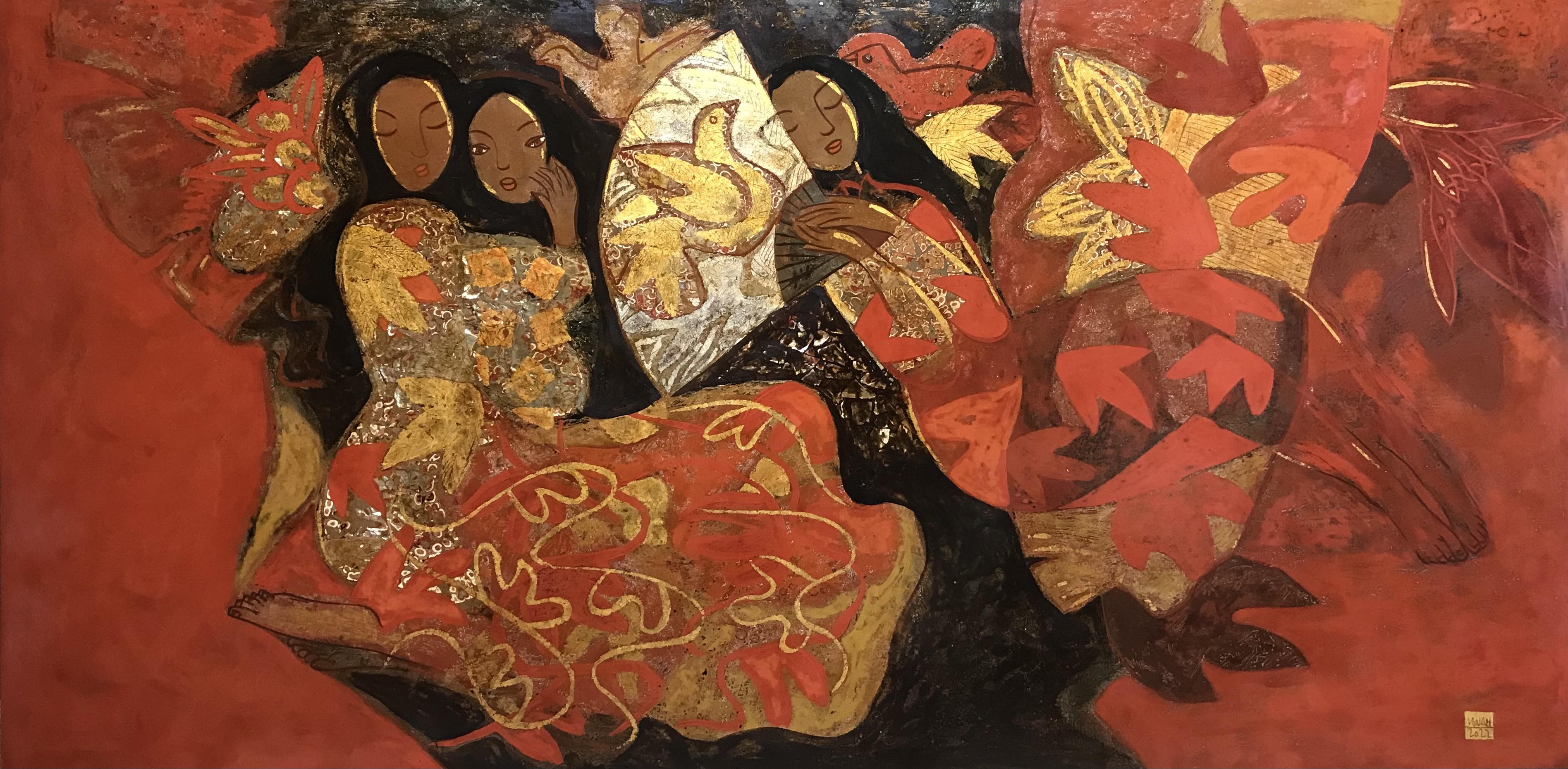 Họa sĩ Nguyễn Hải Nam bay bổng với chất liệu sơn mài truyền thống. Những cô gái trong tranh Nguyễn Hải Nam với họa tiết trên trang phục hòa lẫn cây cỏ, vũ điệu uyển chuyển… làm nên những đường nét mơ màng. Ước lệ của hình, mảng màu và nét làm ta như trong một giấc mơ của những ngày tháng xưa cũ, khi rêu phong, khi rực rỡ vàng son.