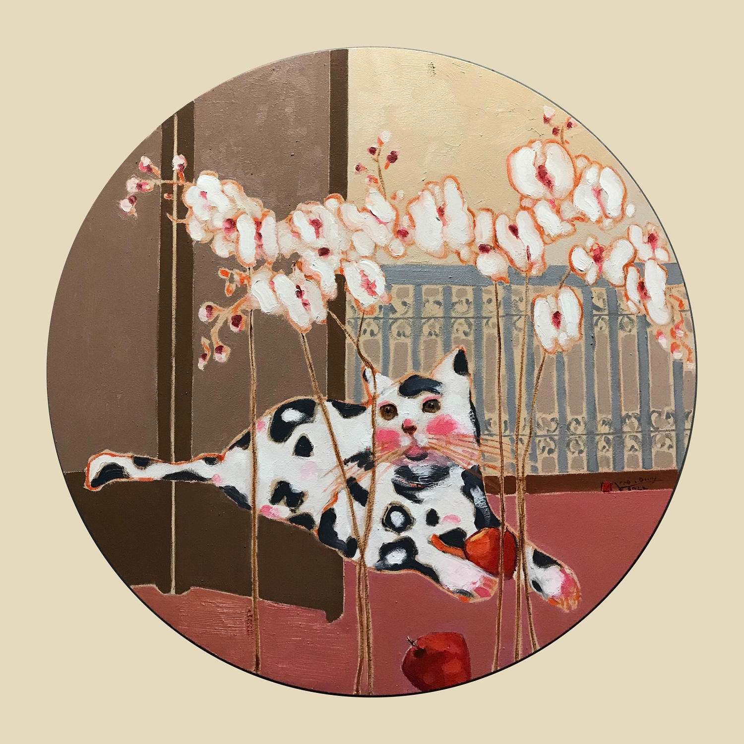 Ở lần triển lãm này, những tác phẩm mang phong vị Tết của Khổng Tú Duy khiến nhiều người cảm thấy nôn nao, rạo rực mỗi dịp “Tết đến, xuân về”. Cùng với đó là những mảng ký ức xưa cũ về một thời vàng son đã qua khi những đồng tiền xu, bình phong... đặc trưng của Tết xưa xuất hiện trong tranh của Khổng Đỗ Duy.